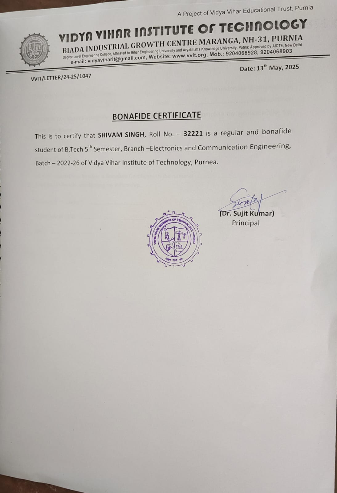 VVIT PURNEA, OFFLINE INTERNSHIP